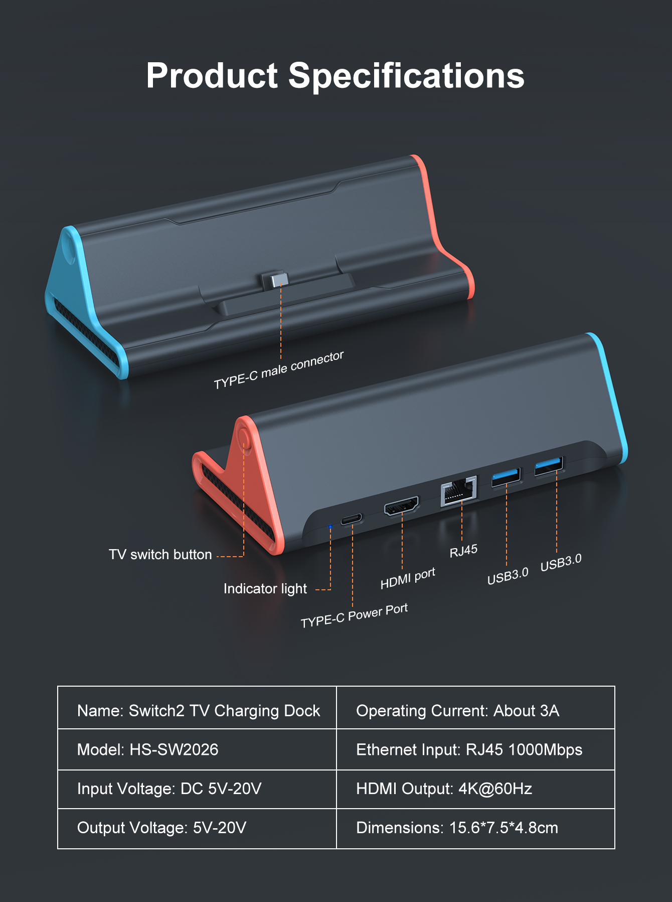TV Docking Station With 1000Mbs Ethernet for Switch2 Console