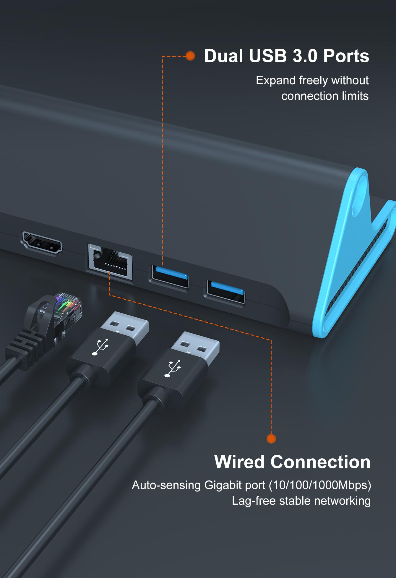 *Built-in 1000Mbs Ethernet LAN on the dock, you can get a stable and faster network;